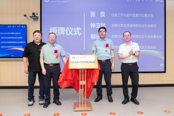 校友工作与合作发展办公室主任张良和钟玉林、柳长青、丁俊平为生物与农业资源学院校友分会揭牌。